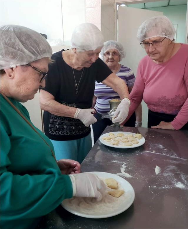 A cozinha prepara e distribui as refeições aos residentes de acordo com os cardápios elaborados pela Nutricionista; ela também realiza a manutenção e higienização dos utensílios utilizados pelos residentes.